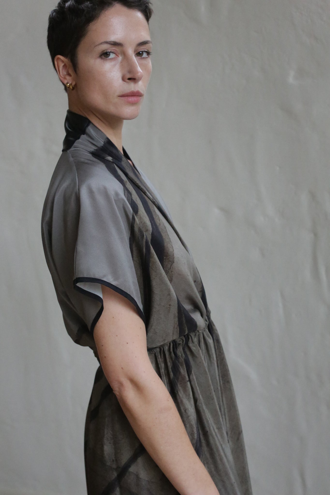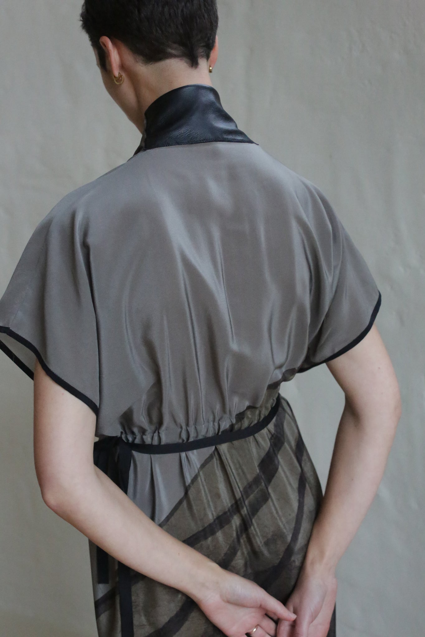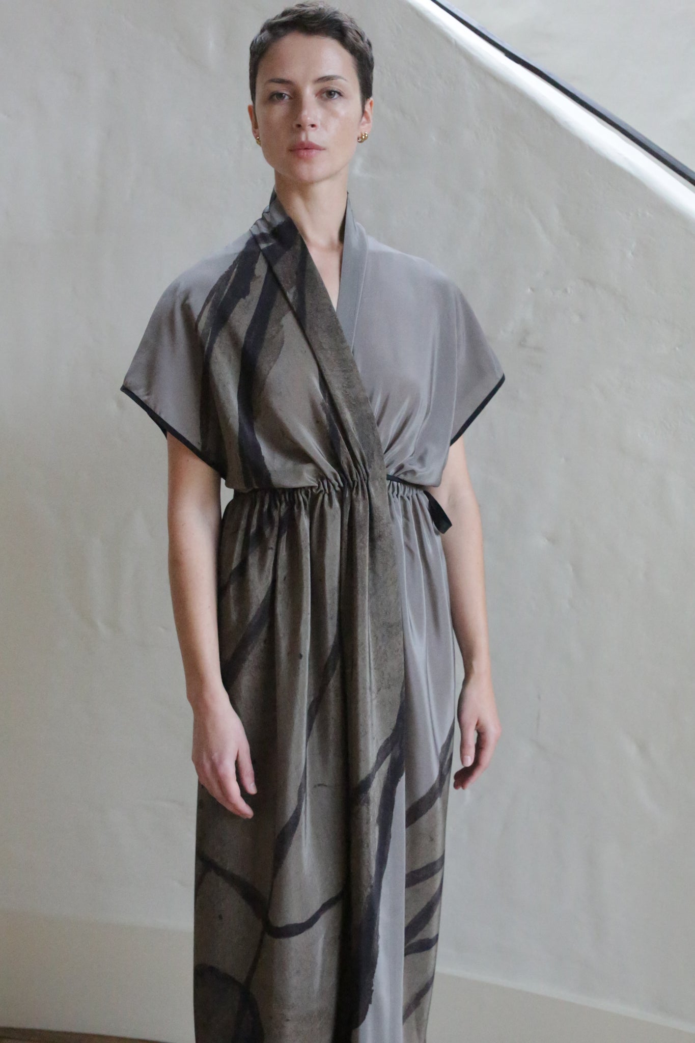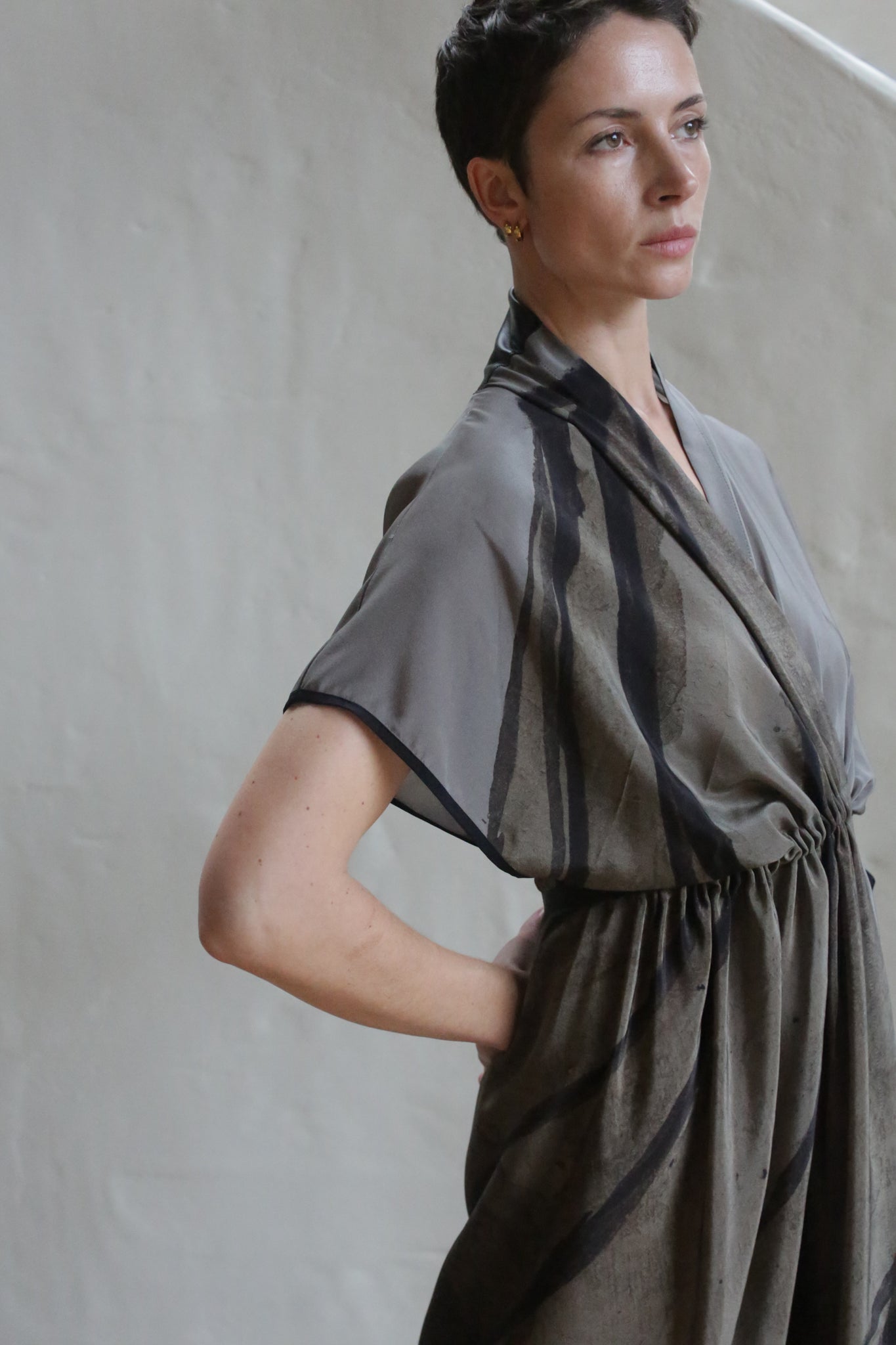 The Lune Dress has been graced by an enlarged single butterfly wing, painted by renowned muralist, Caroline Lizarraga. The image of the wing is gathered in the waist, then graphically spreads across the simple shape of the dress, creating a sense of serenity for the beholder. A leather patch on the back of the neck, enhances strength, adds tactile contrast, and a visual accent.