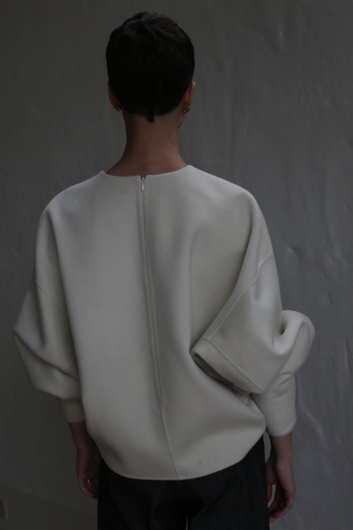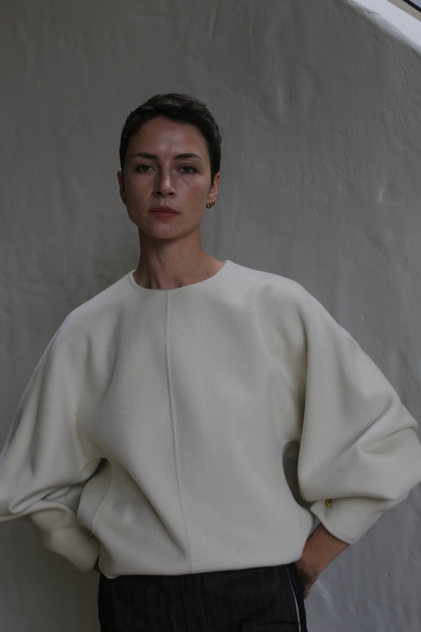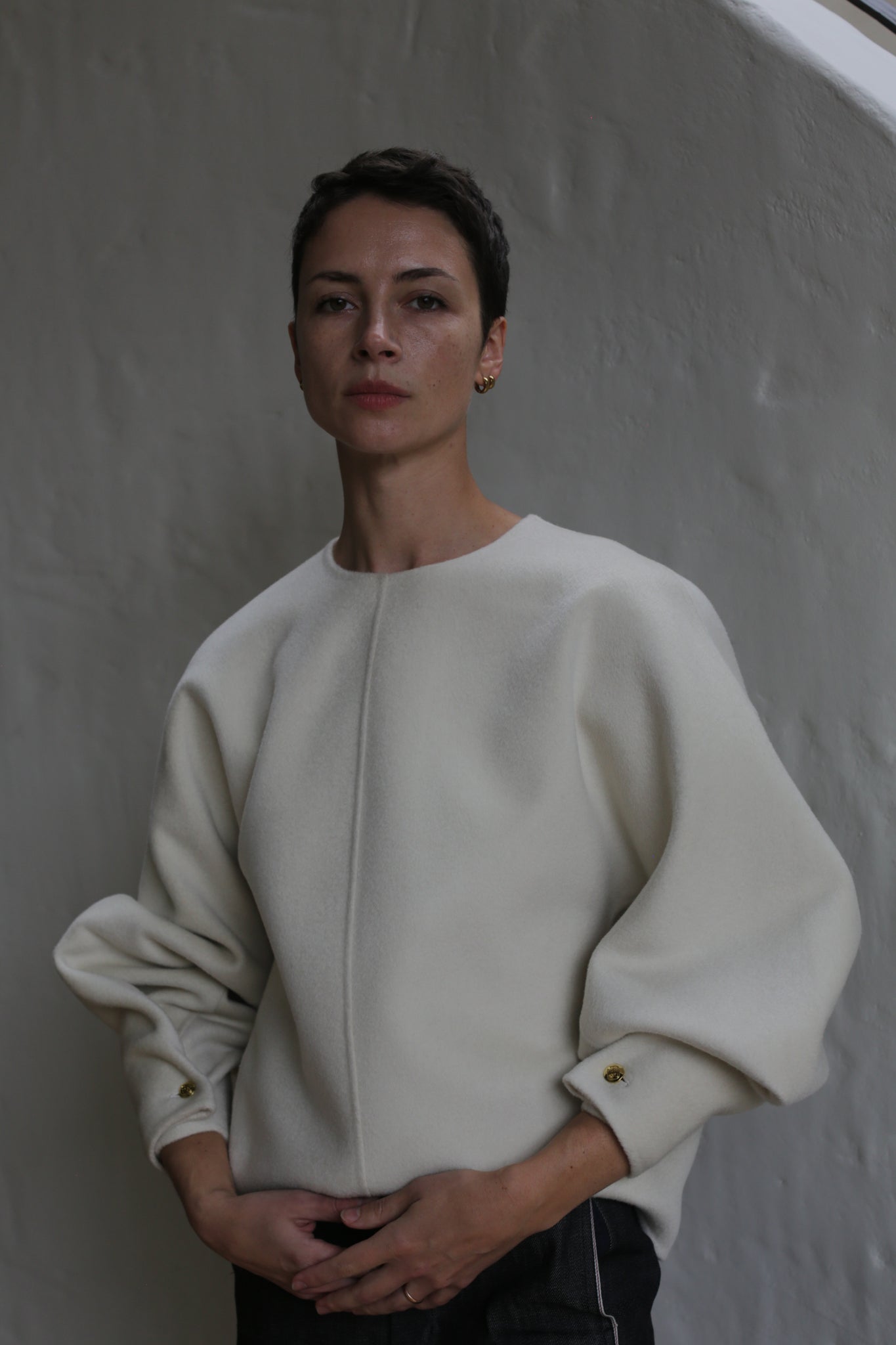 This voluptuous, unisex top embodies luxury, cocooning you in pure double face cashmere. Three custom-molded Lan Jaenicke gold buttons allow you to adjust the volume of sleeve. The fine zipper can be worn front or back.