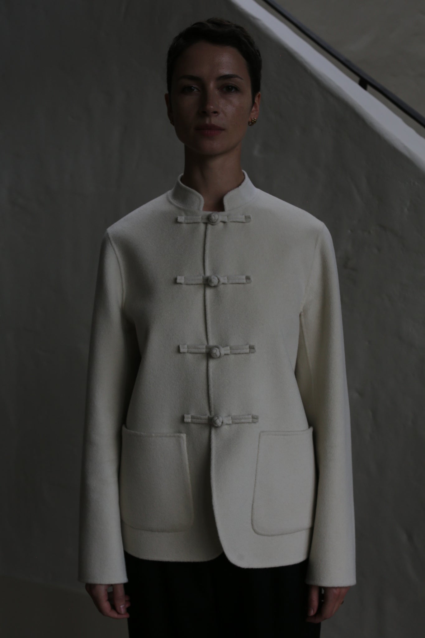 A person models the Mandarin Jacket | Undyed, a cream-colored, high-collared coat with three knotted button closures, standing against a plain textured background. The image is cropped at the neck and waist.