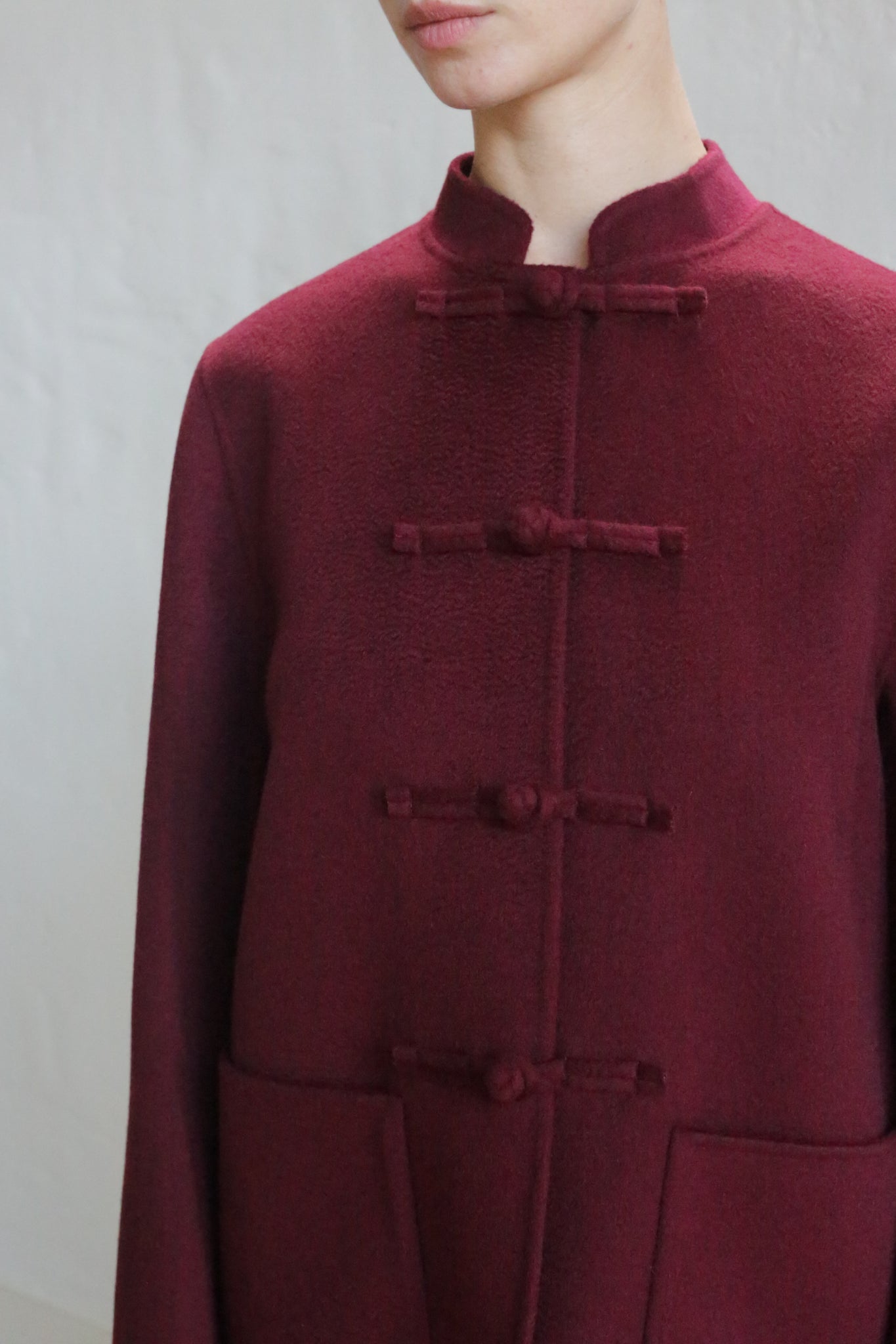 The classic Mandarin Jacket has been given a revamp in pure double face cashmere. Everything, down to the traditional frog closures, has been realized in this utterly luxurious fabric, the Watermark version add enchanting visual patterning. Its timeless silhouette is unisex and highly versatile, able to be worn as outerwear, or layered under a coat.