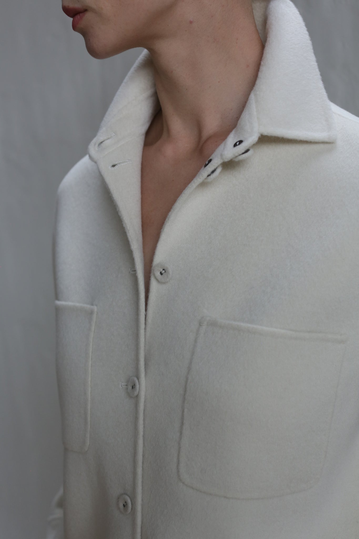 A person wears the Studio Shirt | Undyed—an off-white, button-up fleece jacket with large chest pockets and a turned-up collar—shown from shoulders to just below the chin against a neutral background.