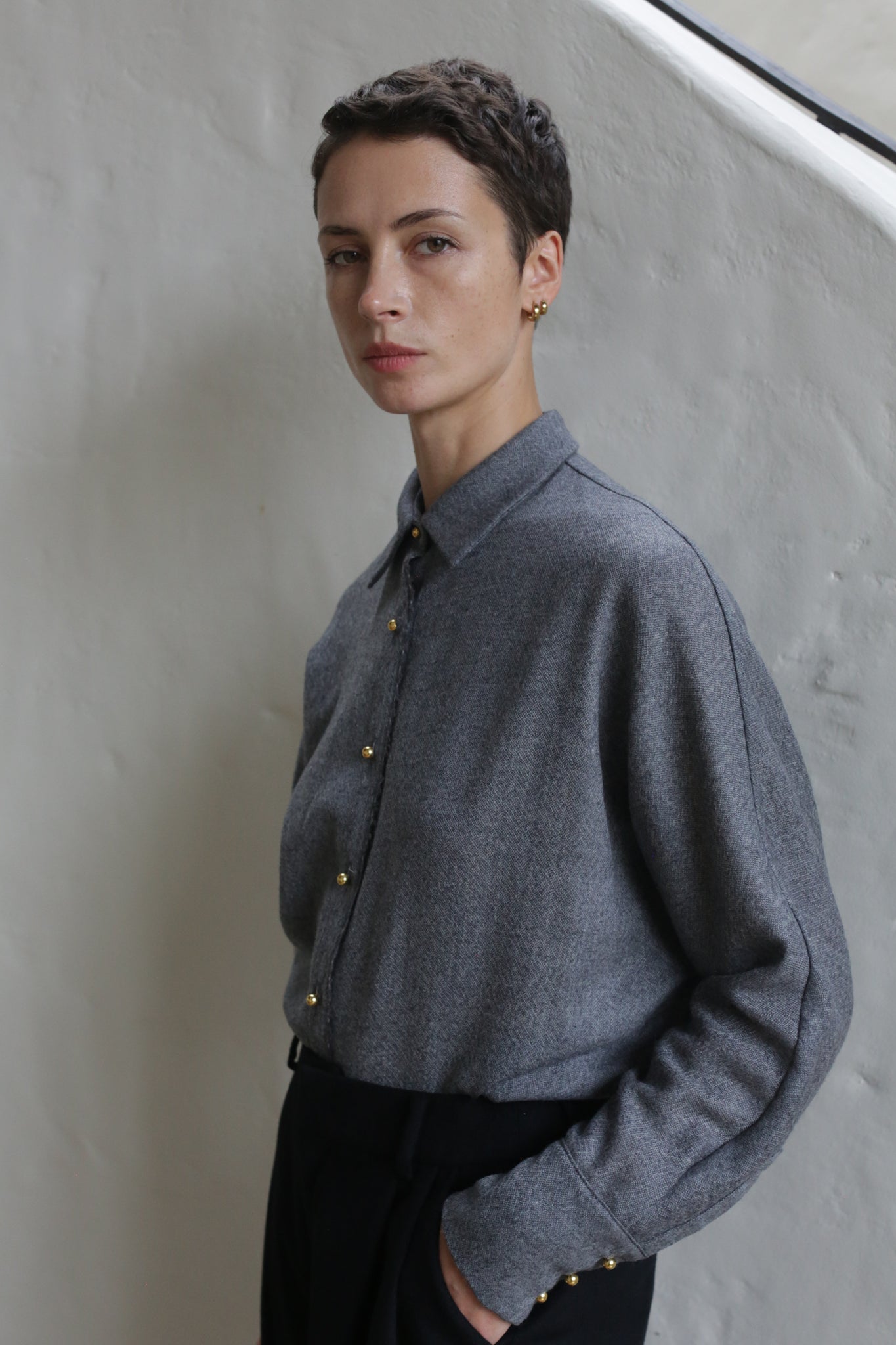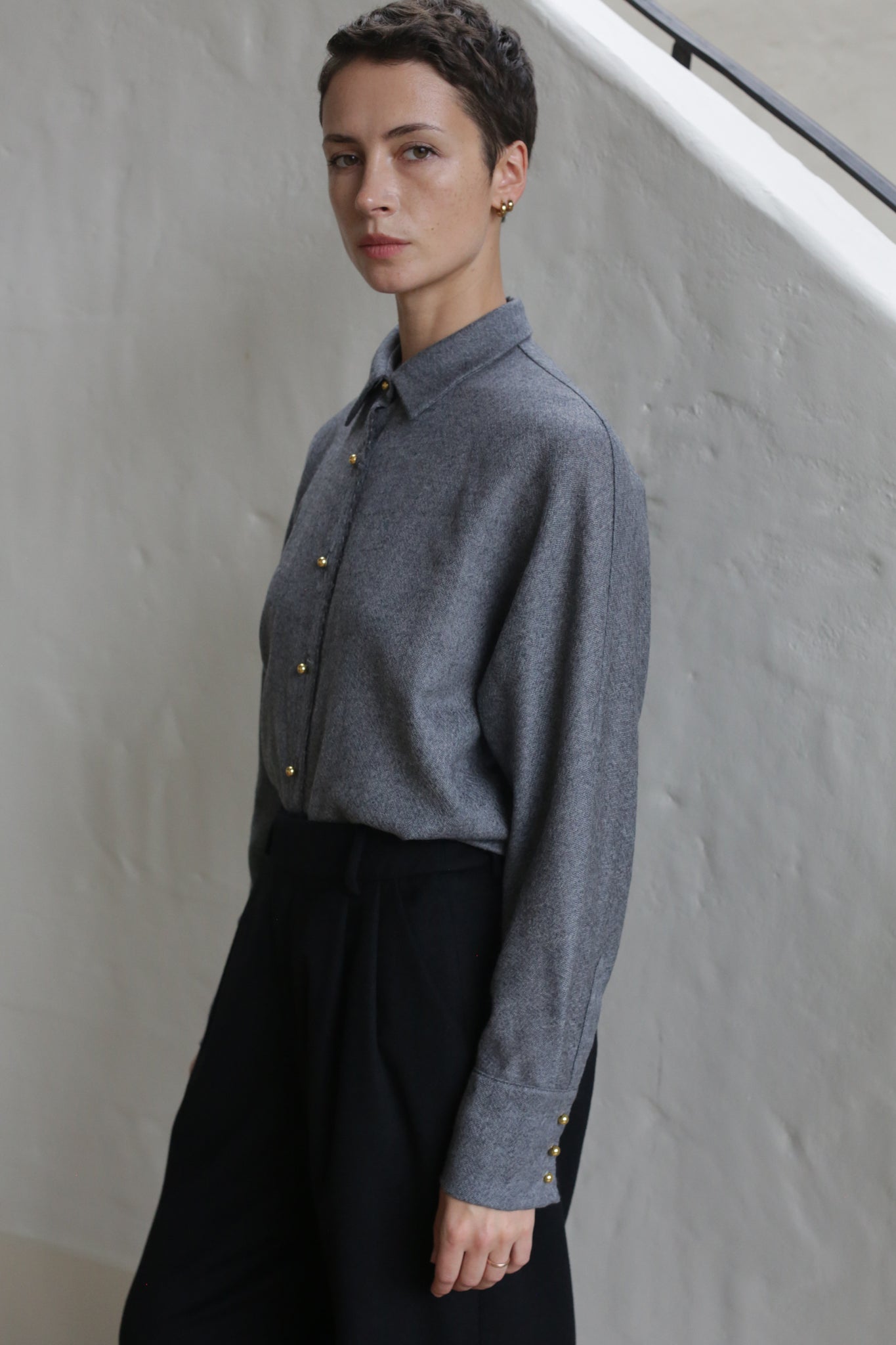 A person with short dark hair wears the Work Shirt | Grey, featuring gold buttons, and black pants while standing with hands in pockets against a light-colored textured wall.