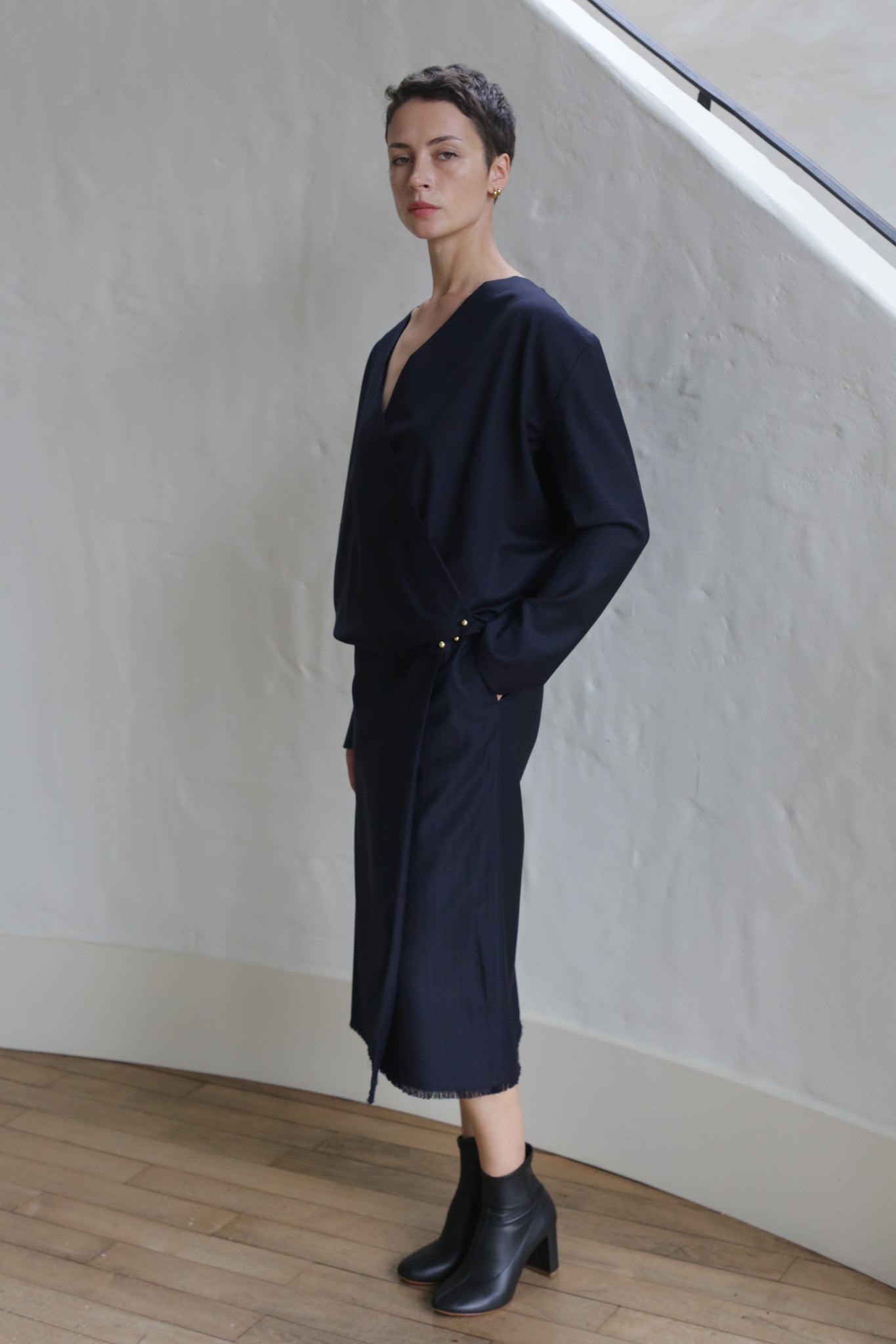 Wrap Skirt | Merino Wool Pinstripe Navy