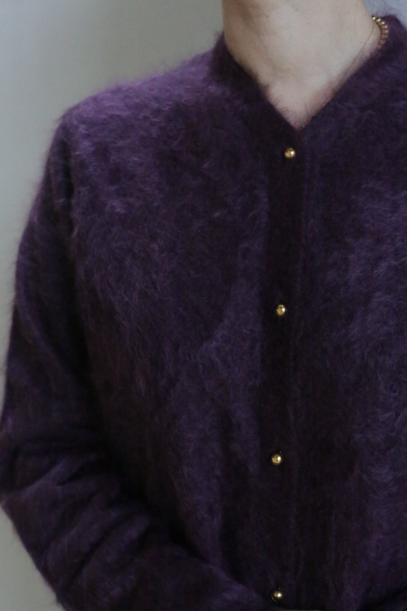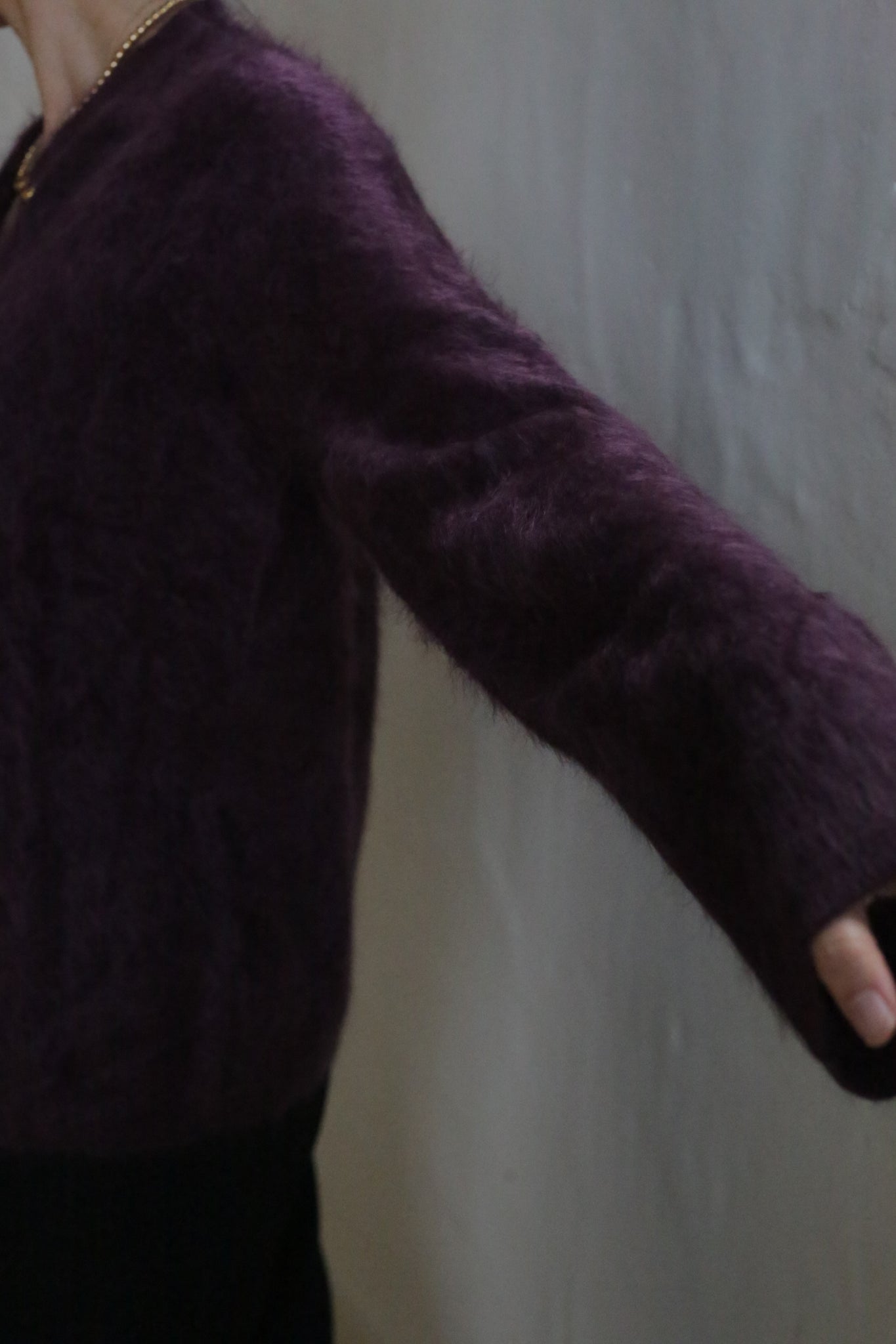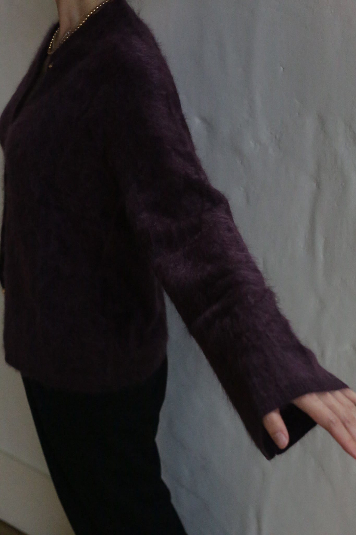 A person in a fuzzy Brushed Cashmere Cardigan | Aubergine with gold buttons stands against a neutral background, hands gently clasped. Their face is turned away, drawing focus to the cardigan’s luxurious, cozy texture.
