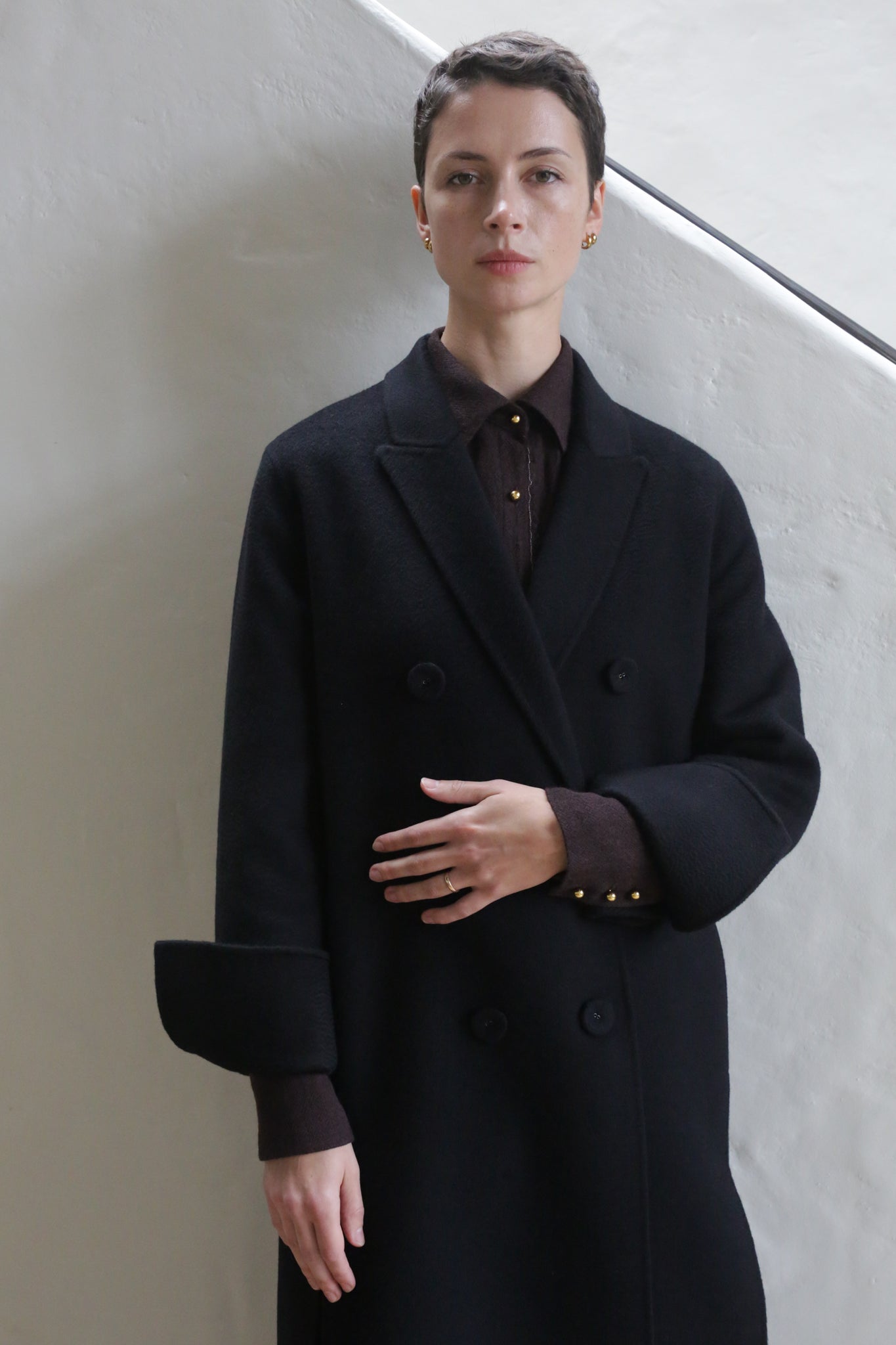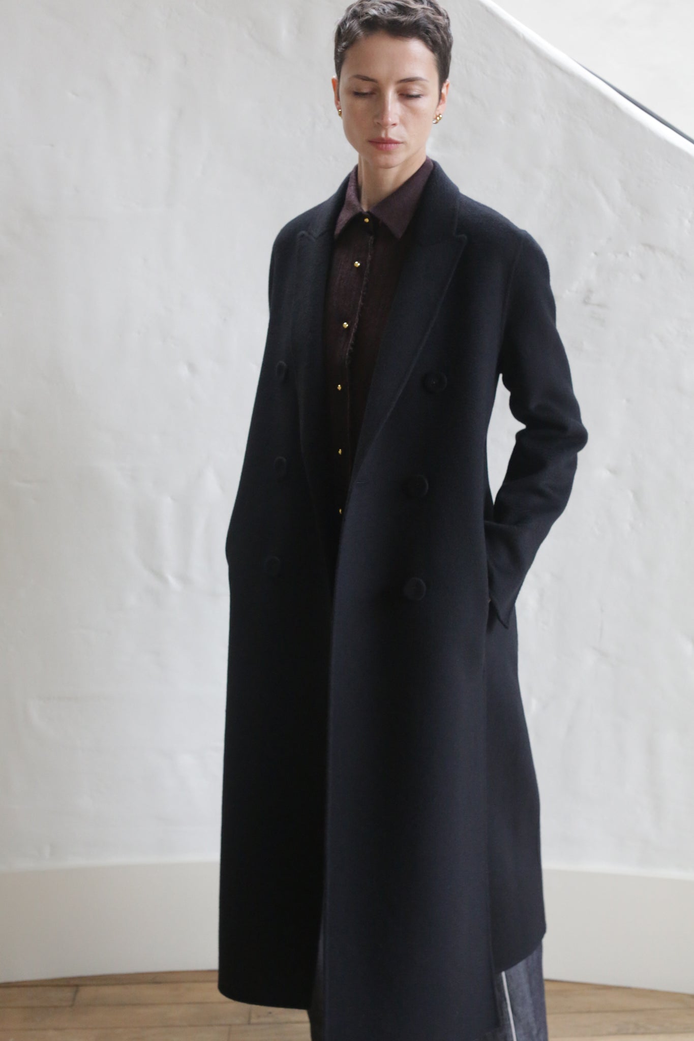 This dynamic coat accentuates movement with long slits along the seams and at the wrists. The Watermark double face cashmere adds visual movement. Double face, double breasted cashmere defines this coat's remarkable volume and drape.